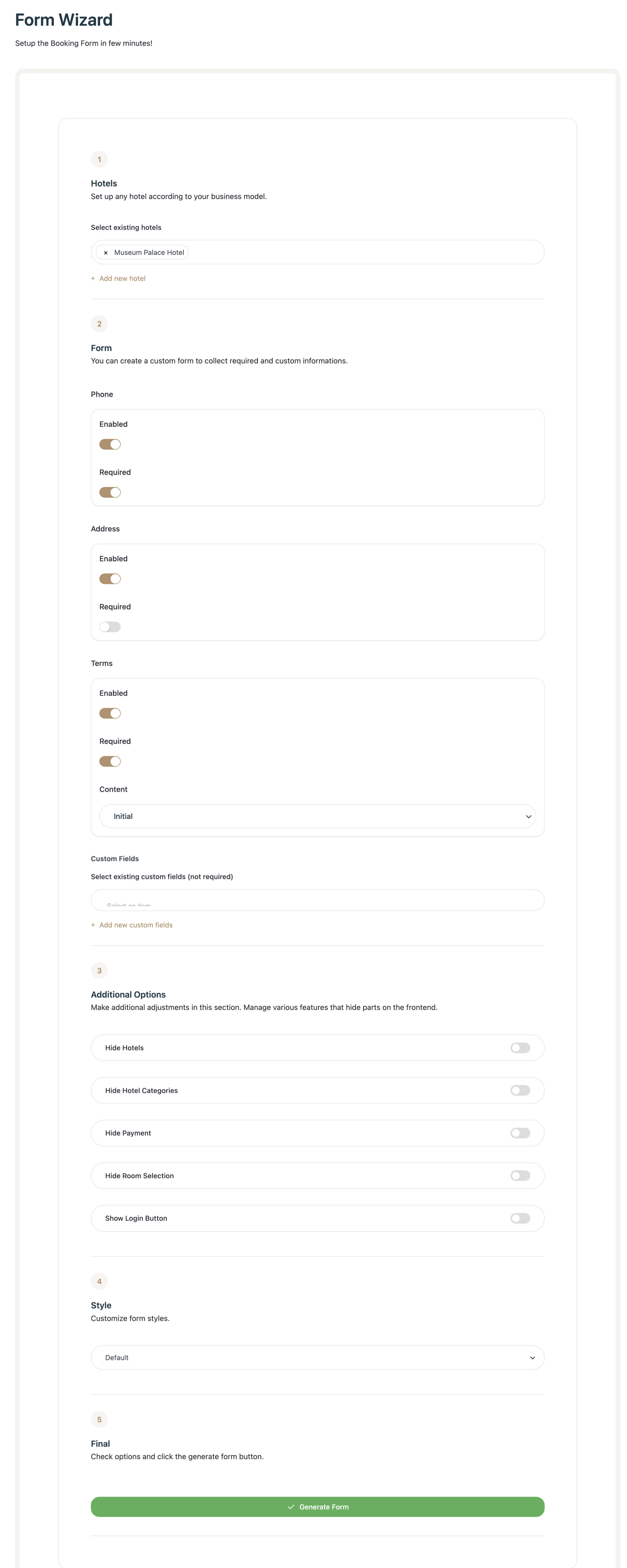 The Form Wizard allows you to quickly create a booking form by following a guided 5-step setup process. It is ideal if you want a structured and fast way to generate booking forms without designing everything manually.